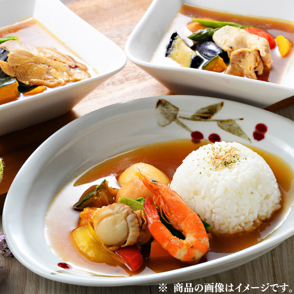 チキン、シーフード、ポークの3種のスープカレーをあつあつでお楽しみください。